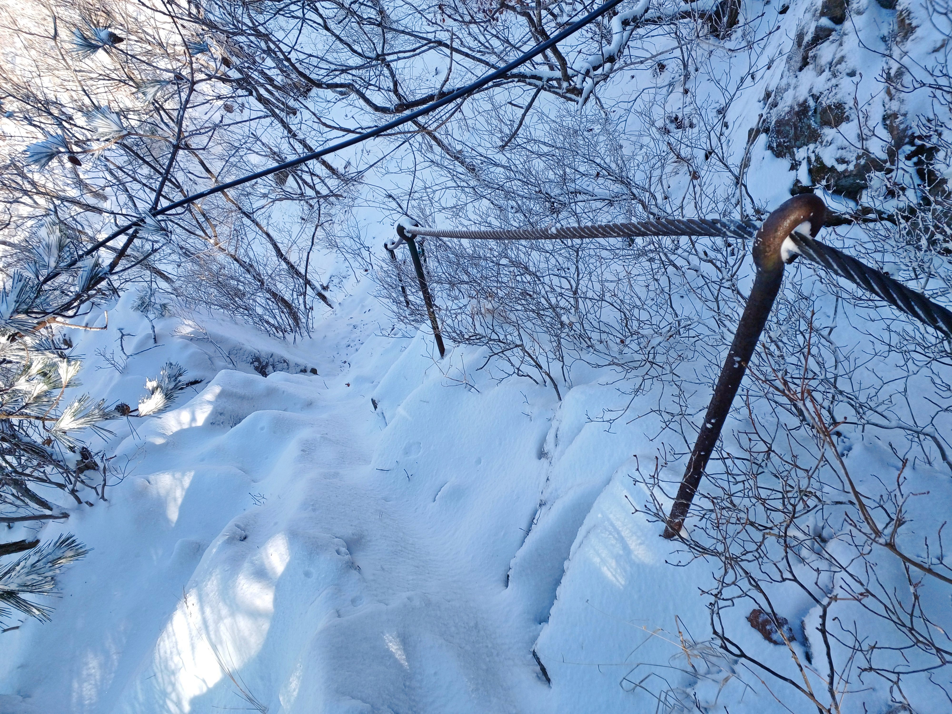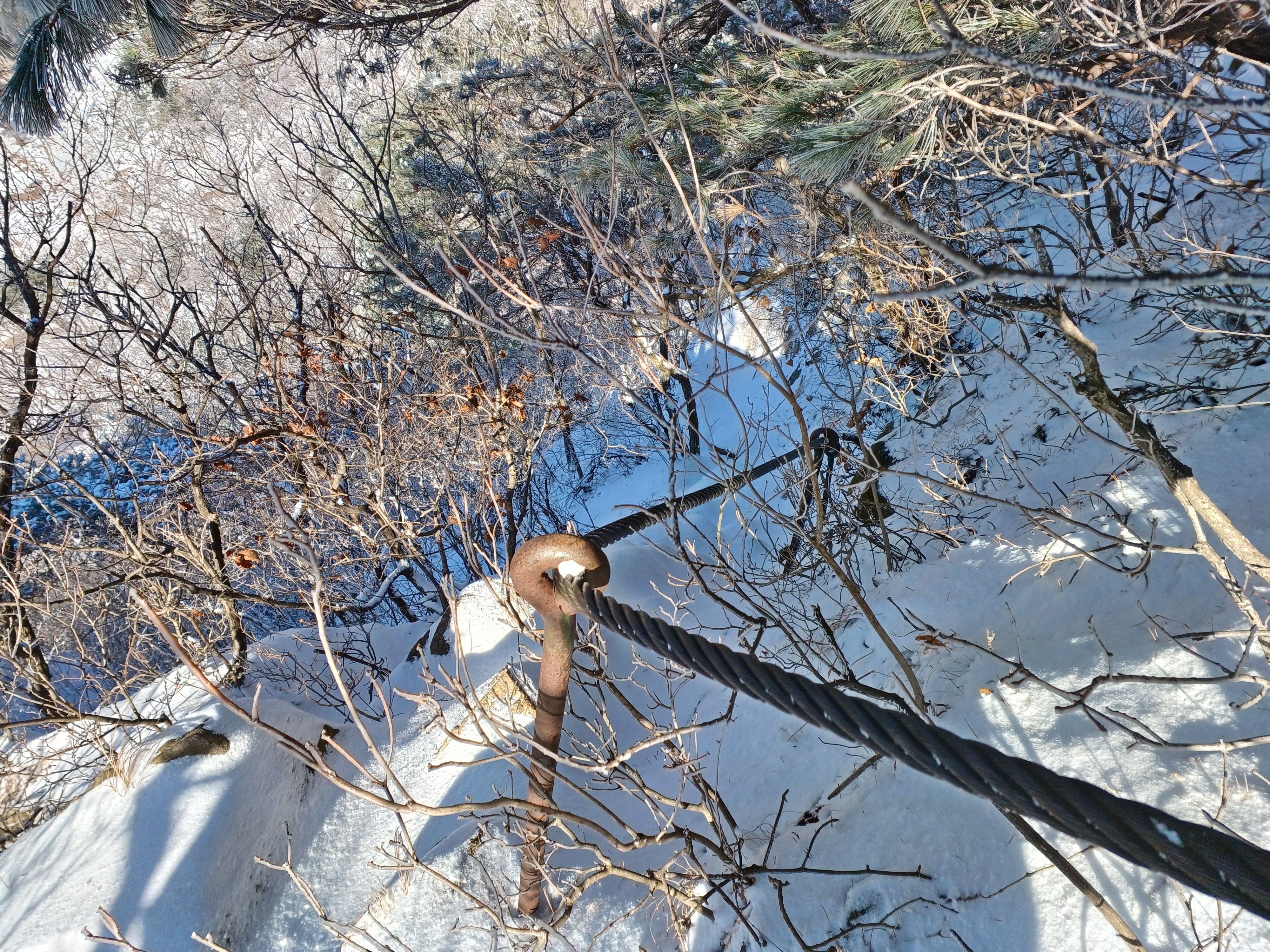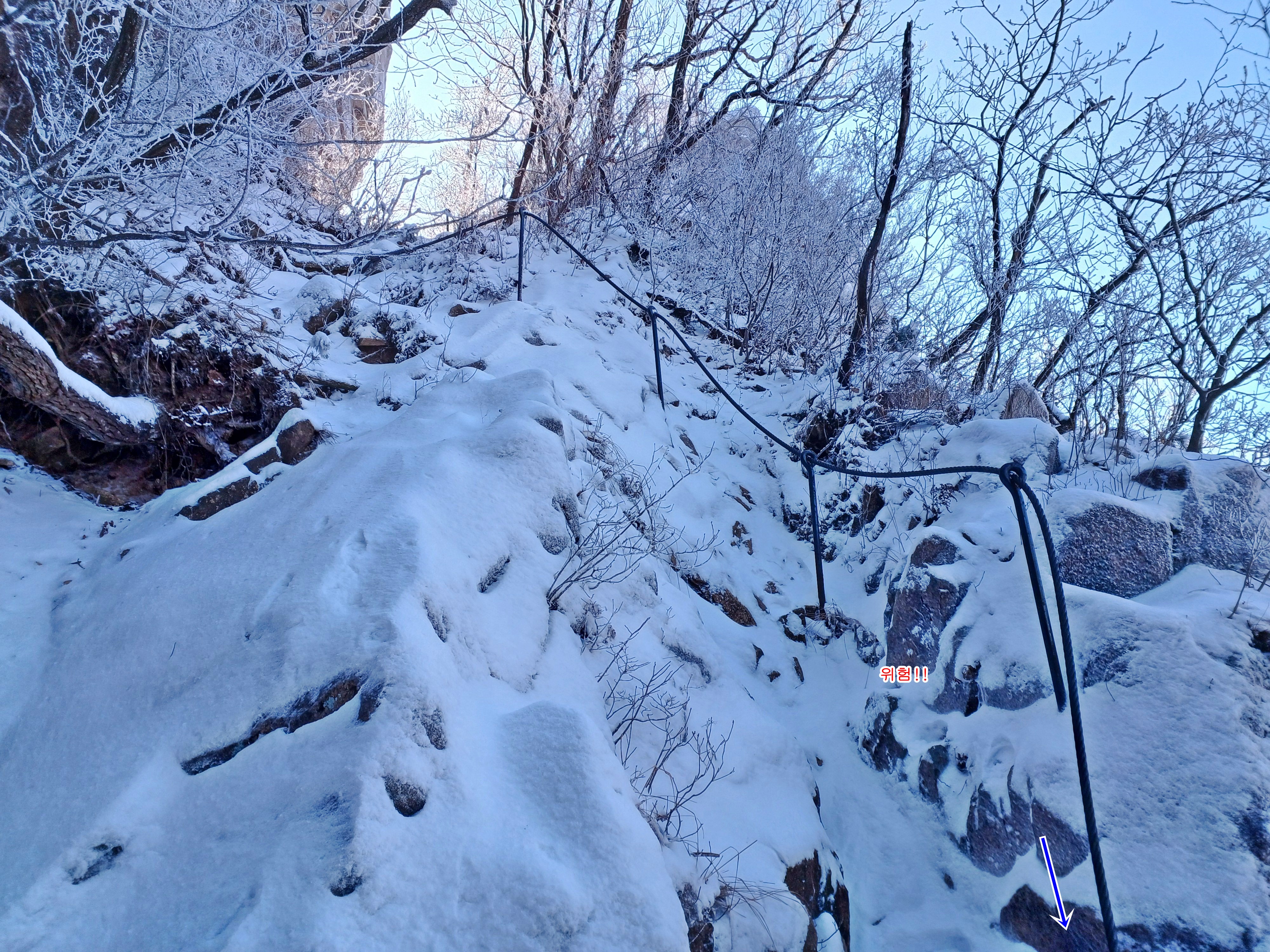 2번째 쇠줄 지주봉을 내려서 올려다보며 우측(사진) 마지막 쇠줄 지주봉은 바위가 얼어있어 진땀 흘리며 내려섭니다.