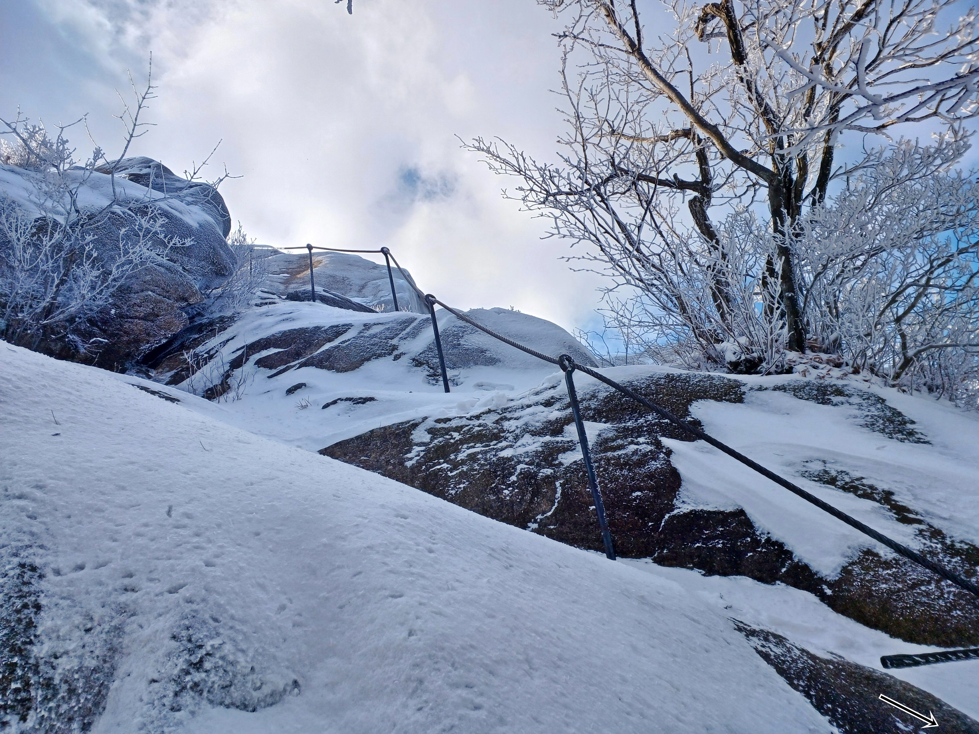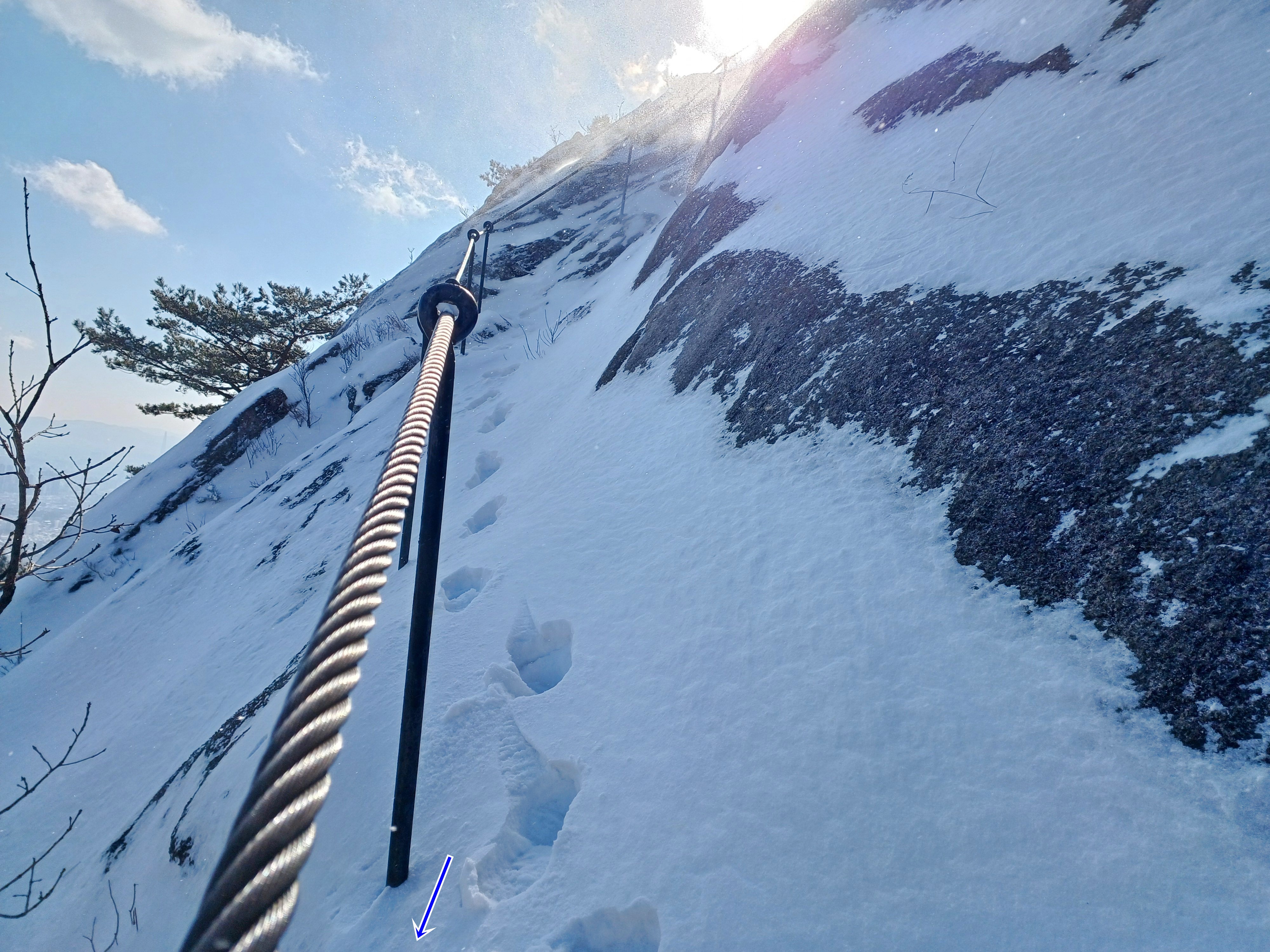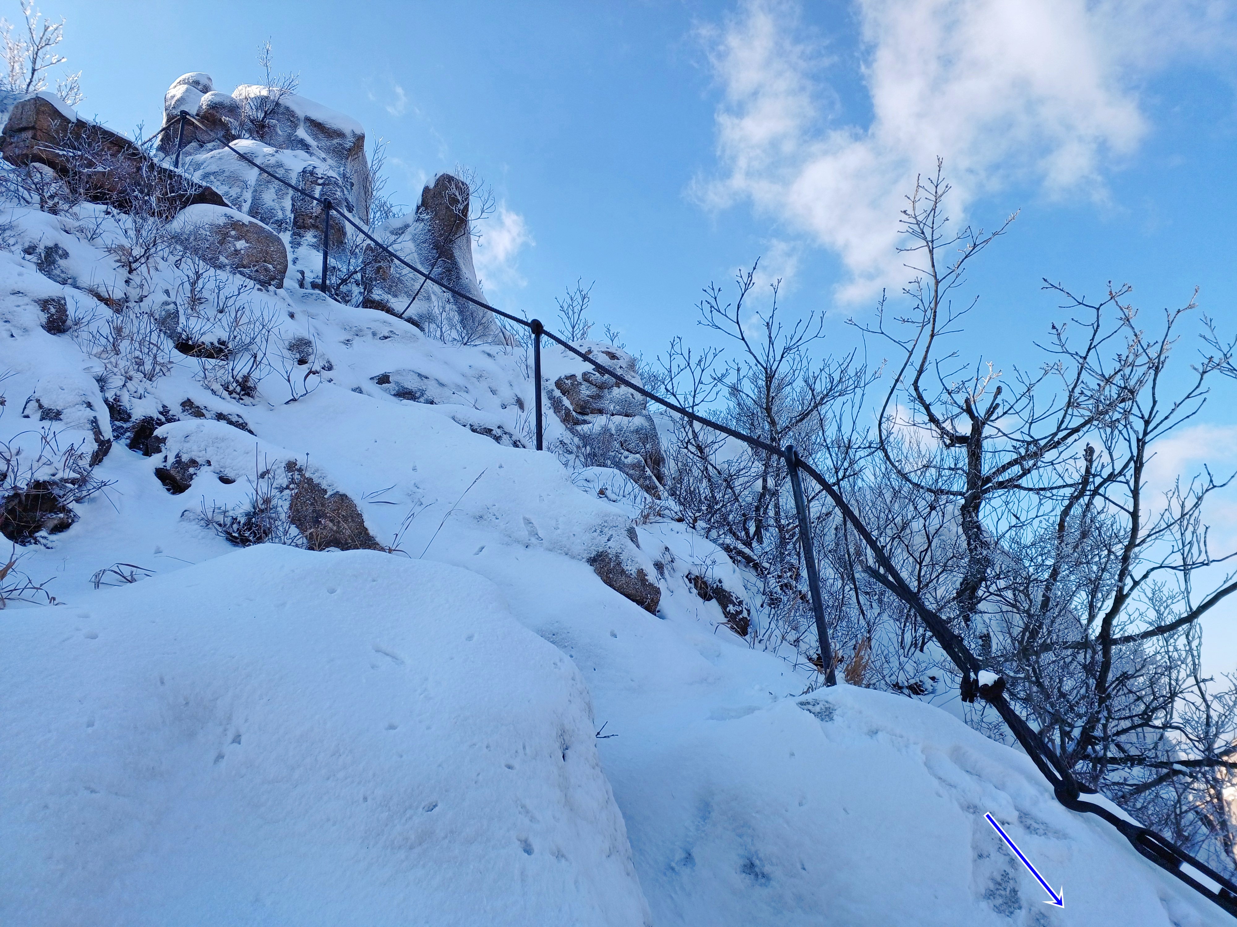 2번째 쇠줄 지주봉을 내려서 올려다보며 우측(사진) 마지막 쇠줄 지주봉은 바위가 얼어있어 진땀 흘리며 내려섭니다.