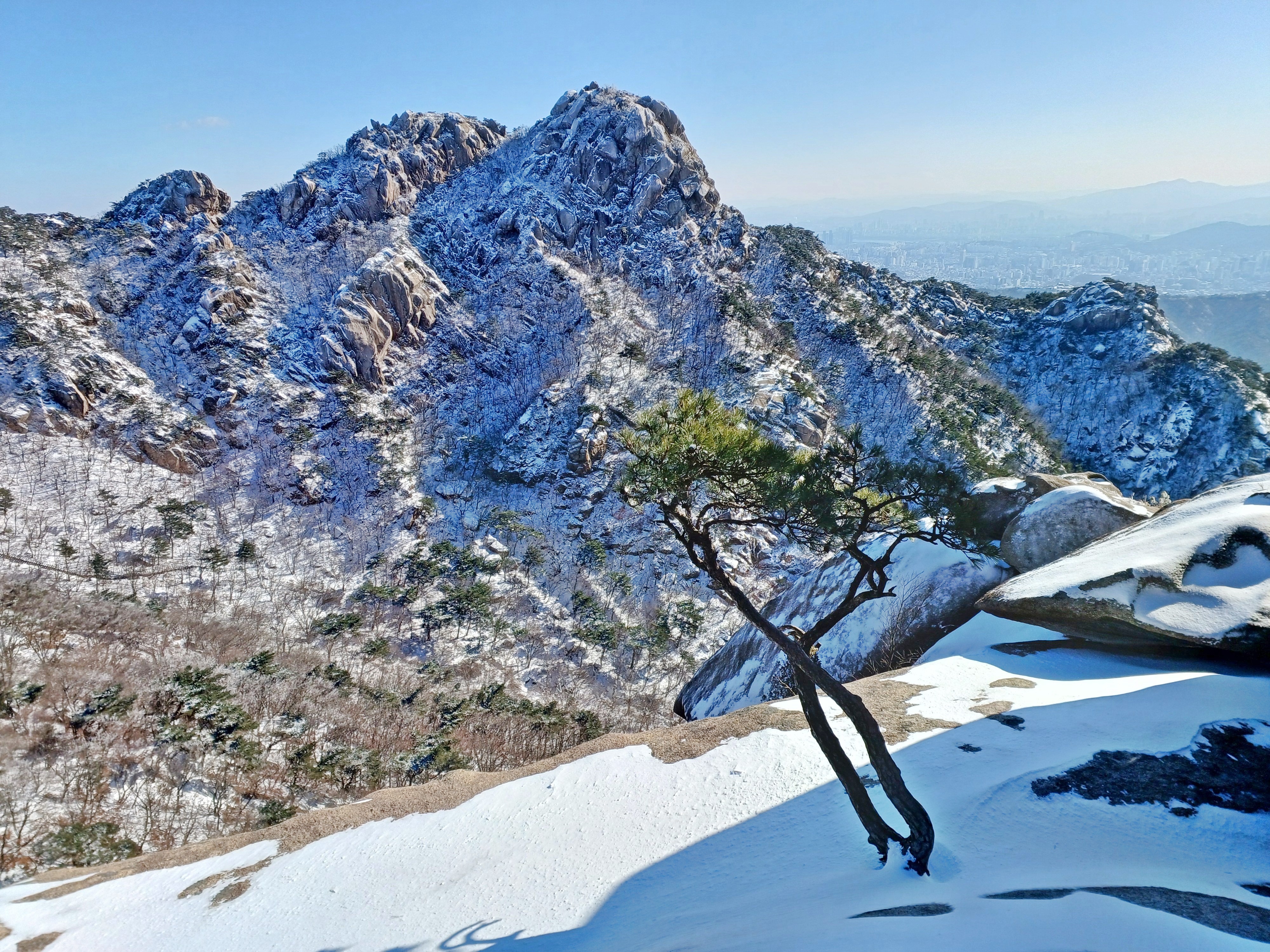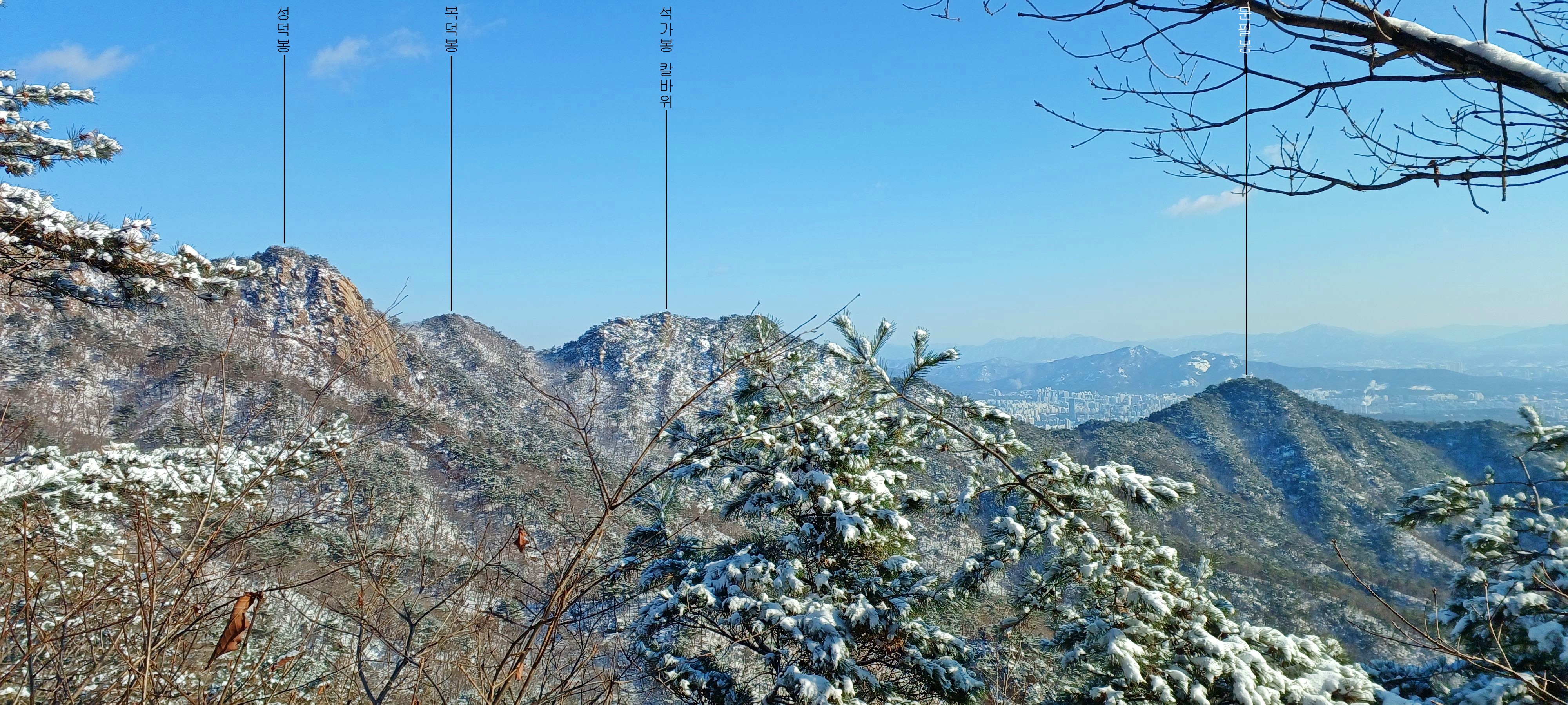 상원봉 멋진 소나무 쉼터를 내려서며 바라본 원효봉과 삼각산 총사령부 그리고 중흥사
