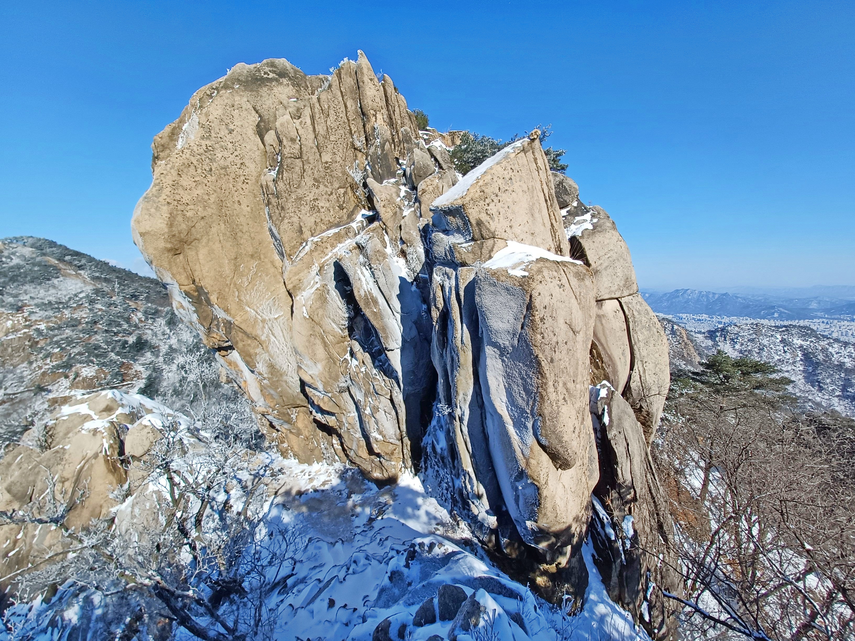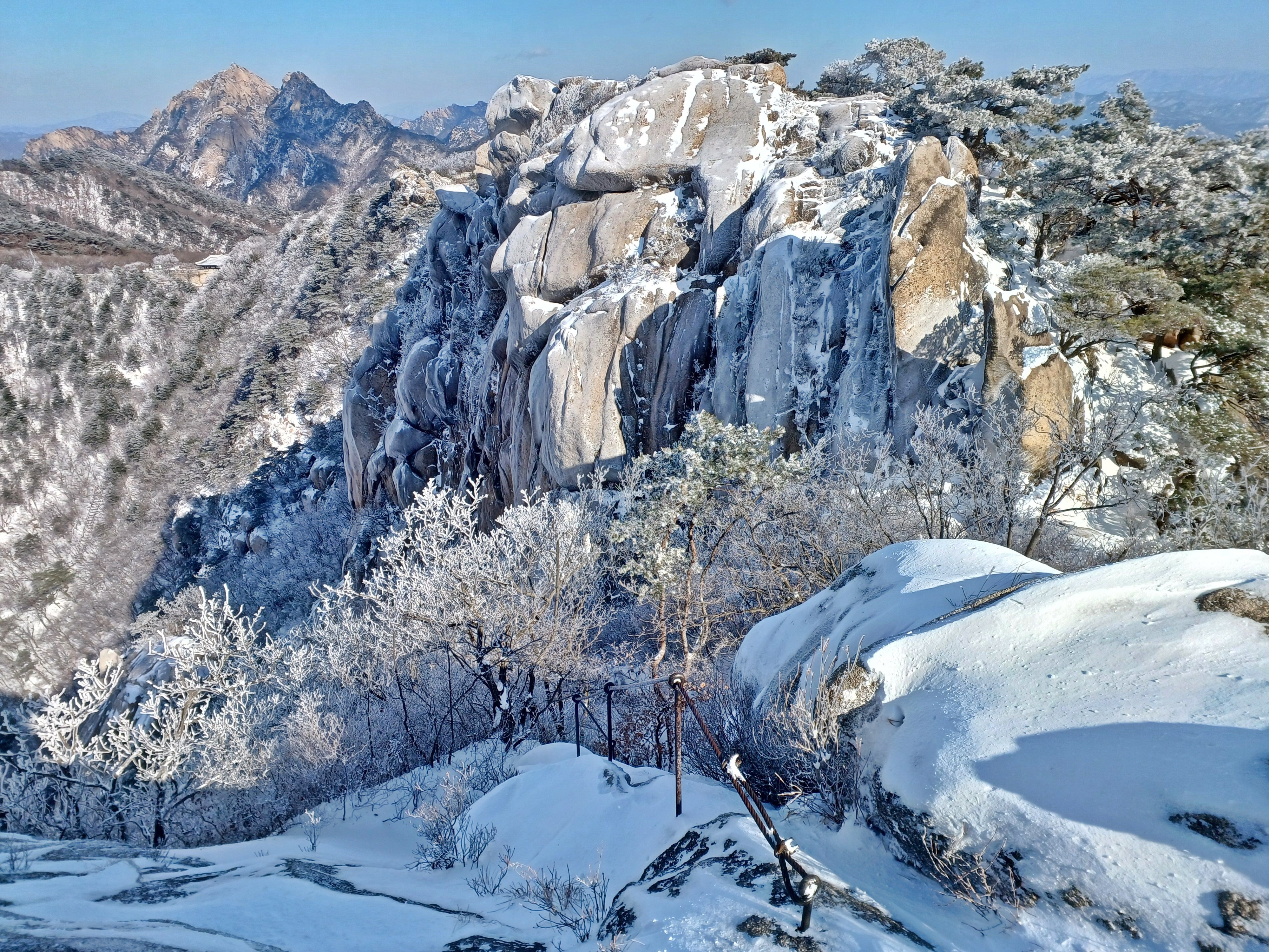 바위가 꽁꽁 얼어있고 살짝 덮인 눈으로 힘들게 보현2봉을 내려서 올려다보며.........................