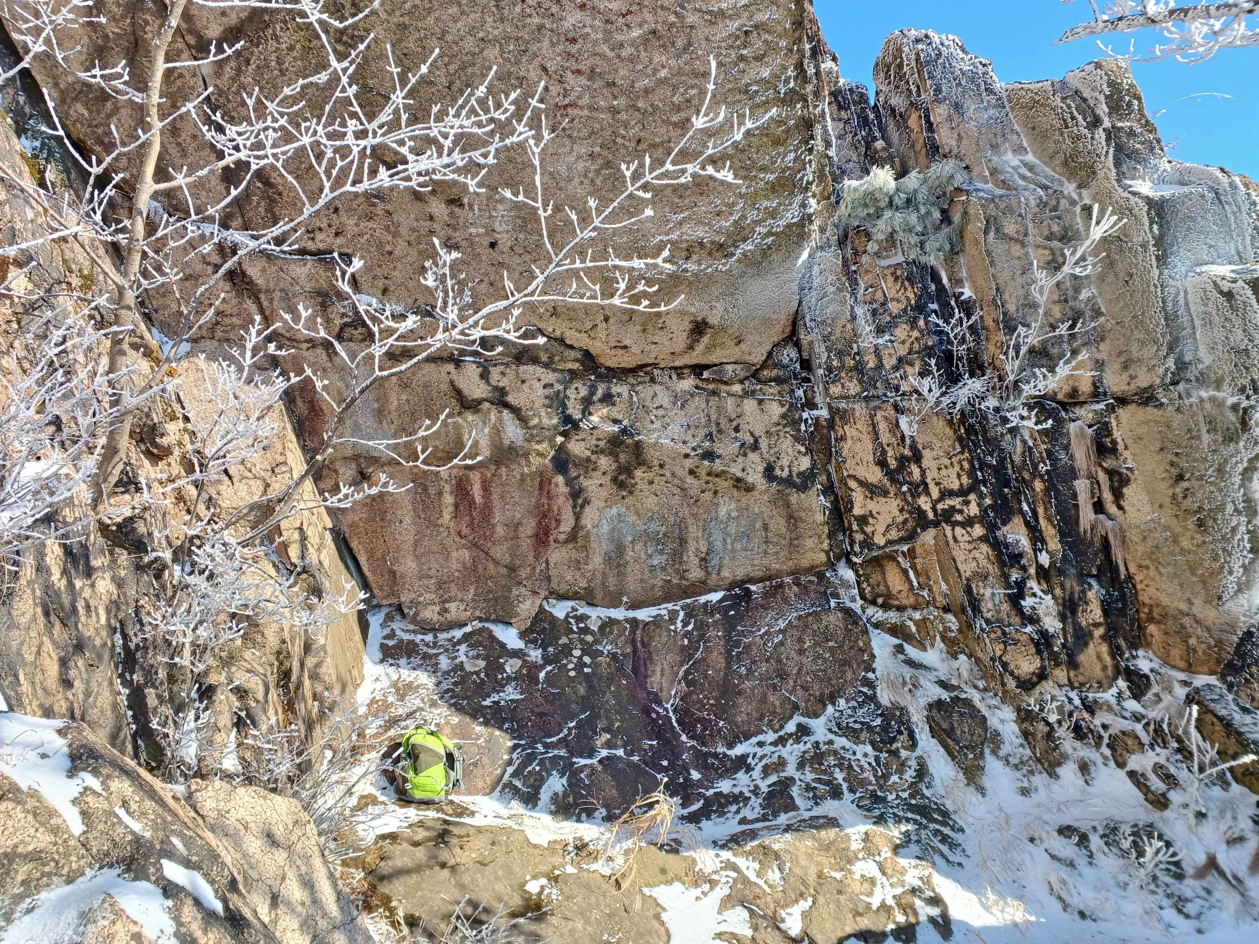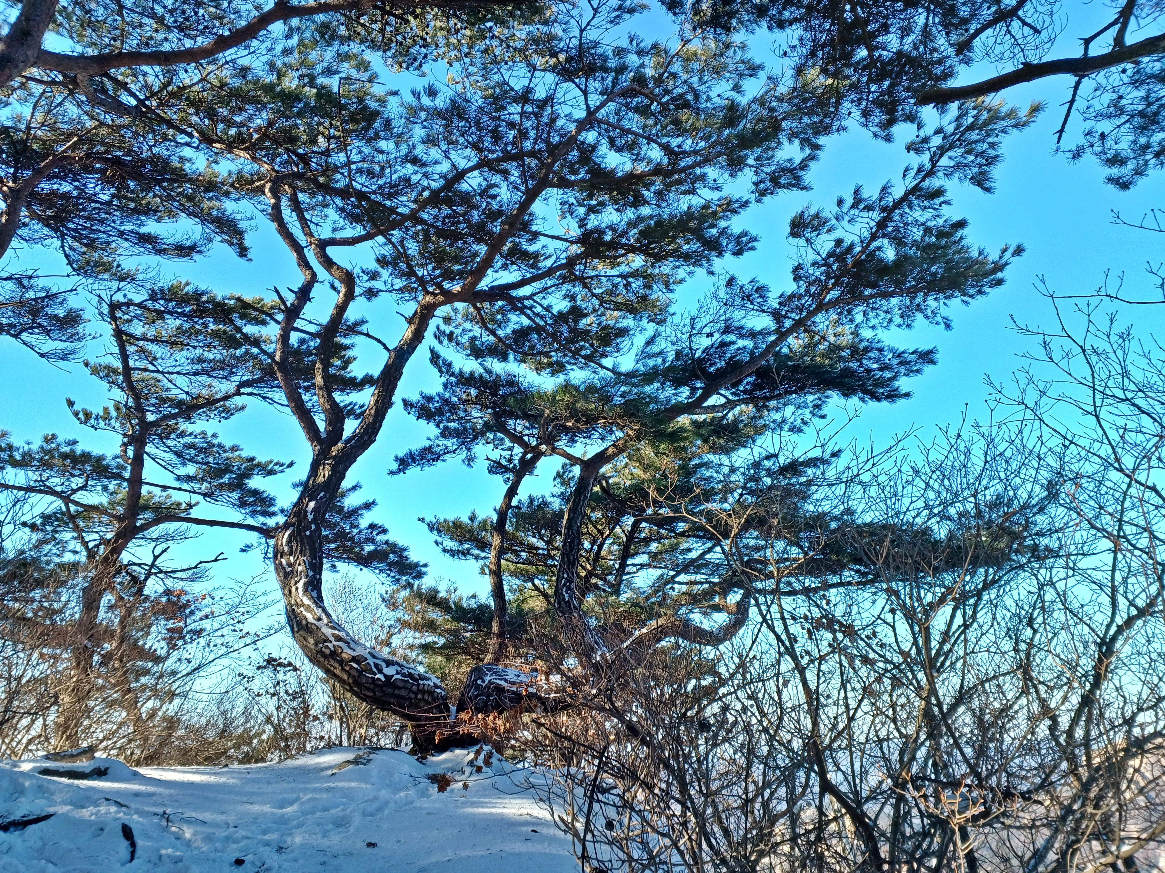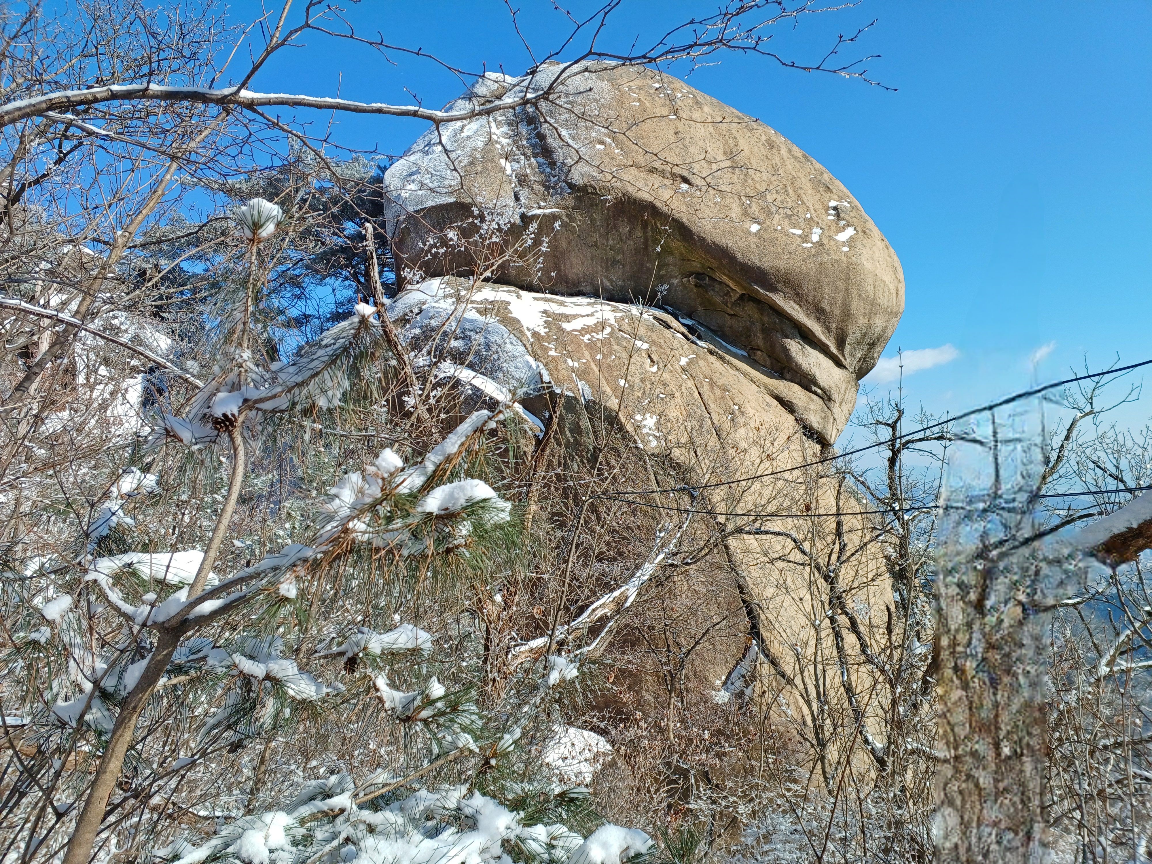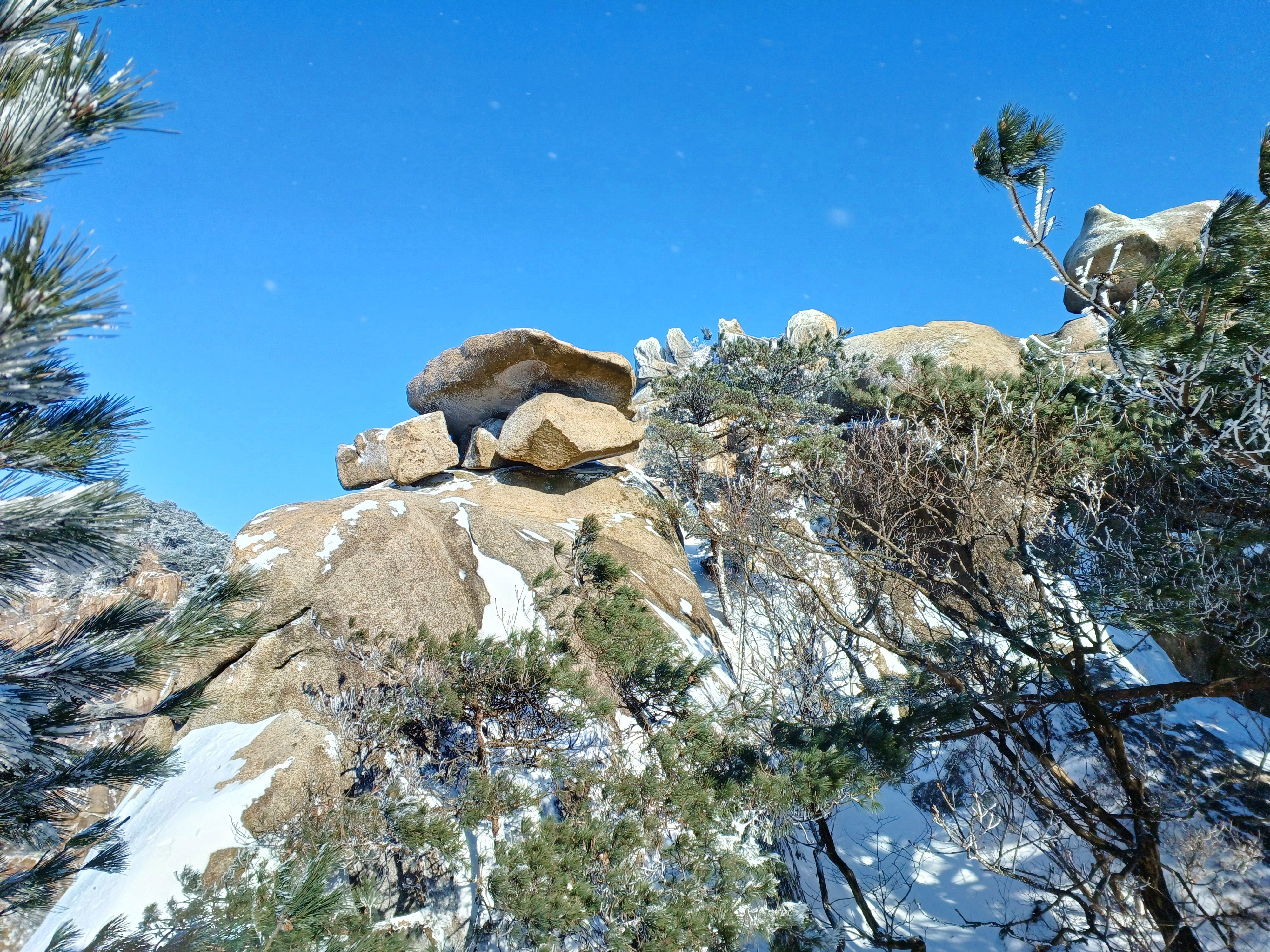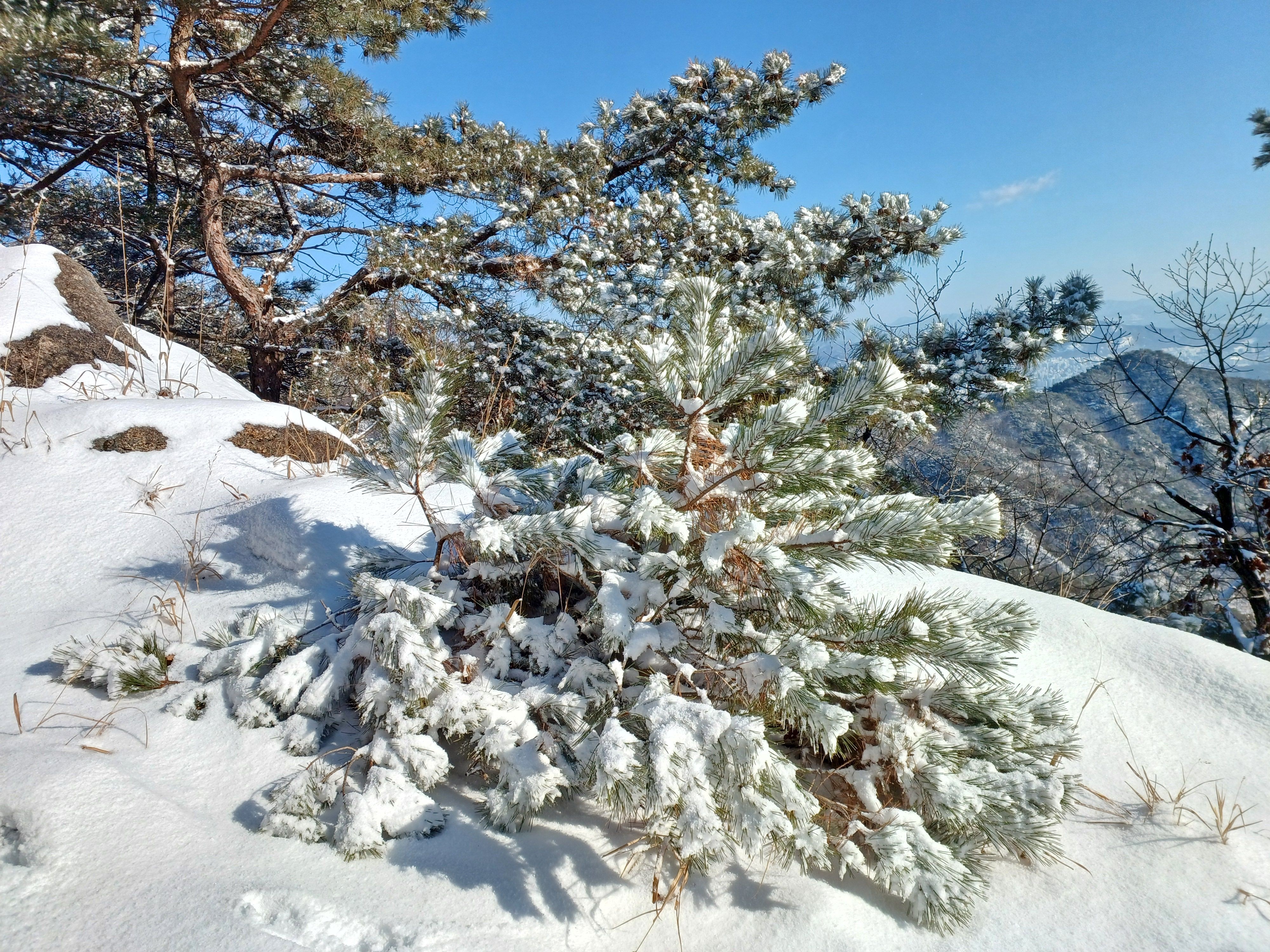바위에 드러누운 눈덮인 소나무
