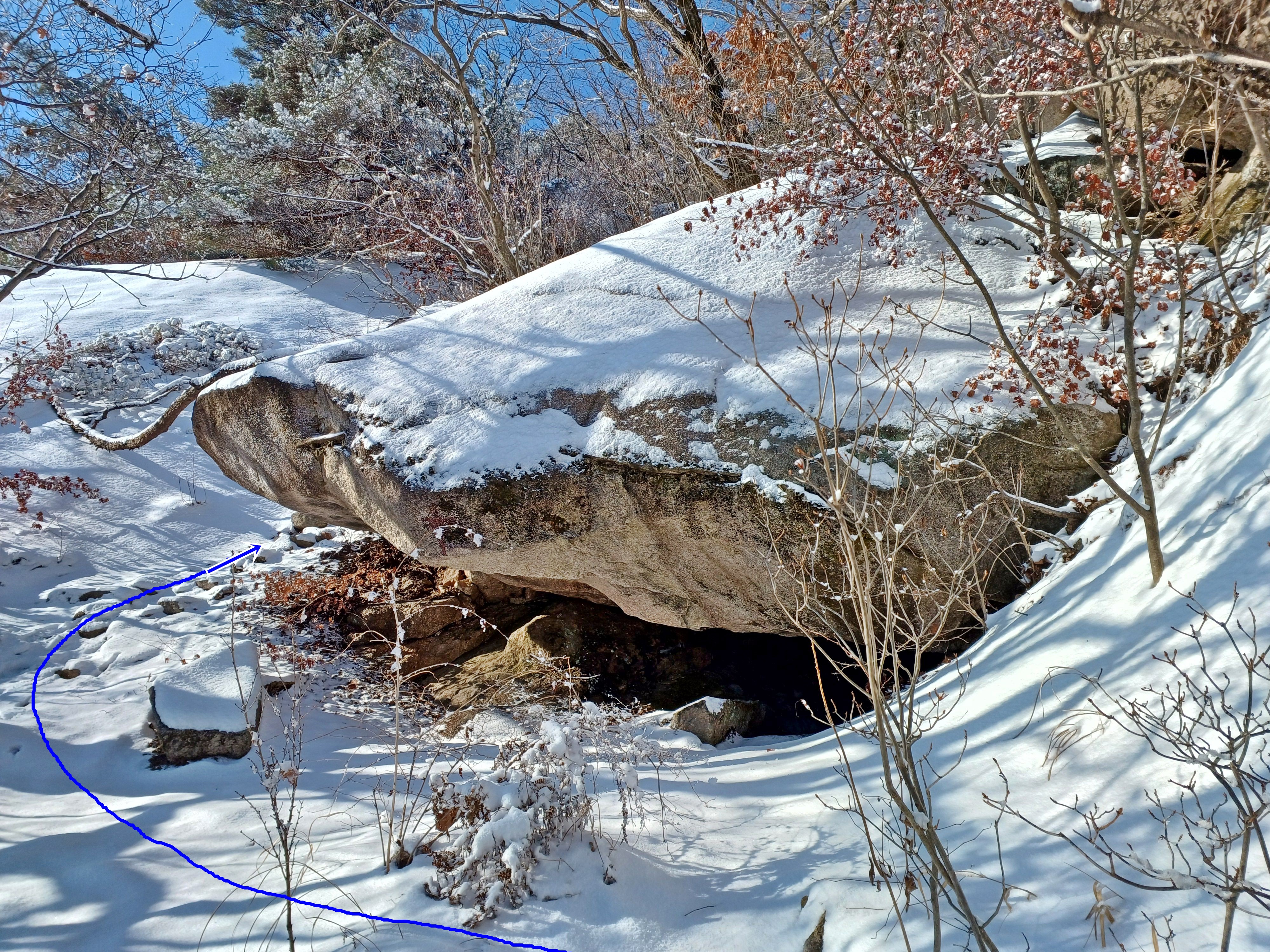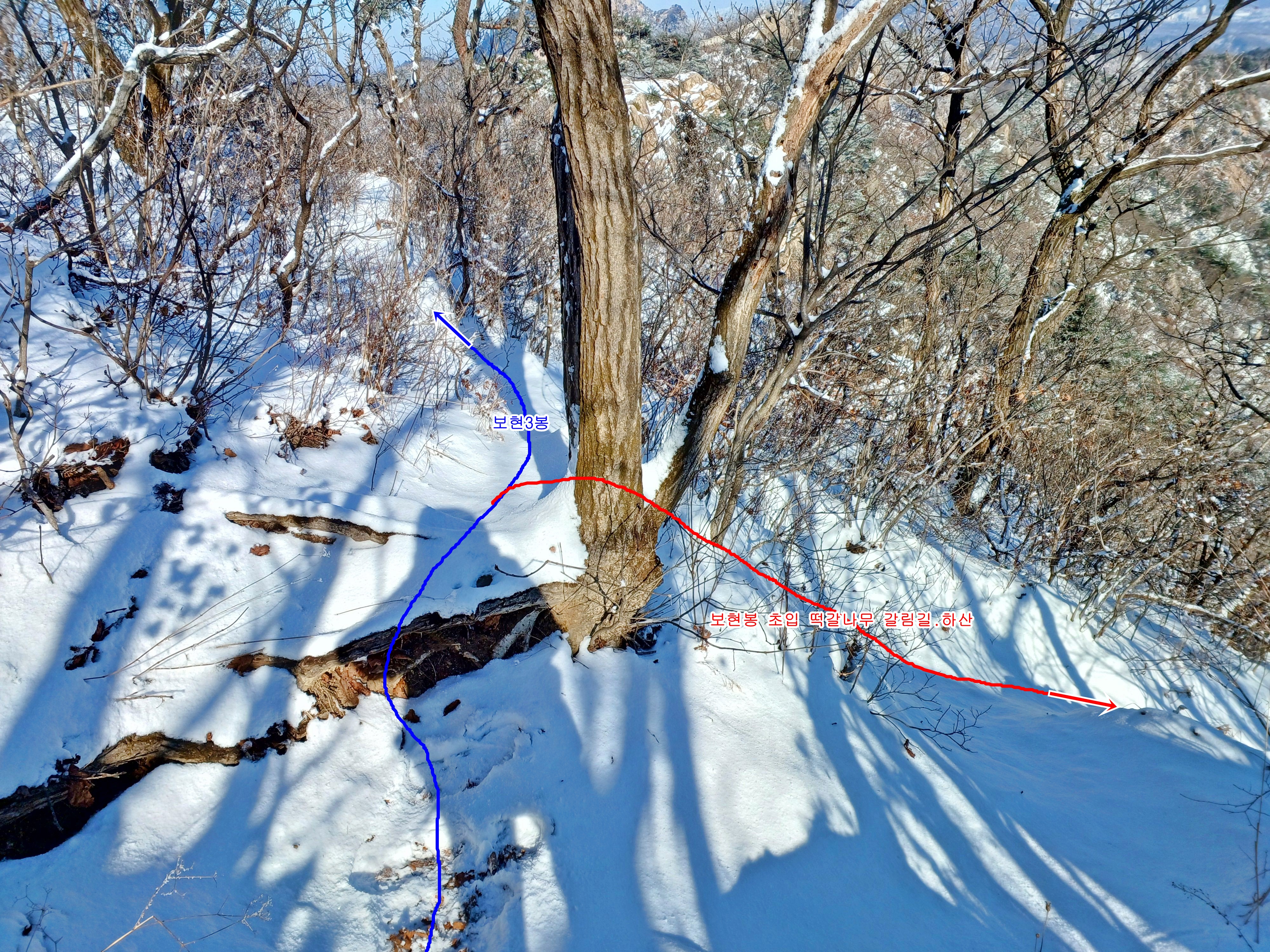 금지목을 넘어 이곳 갈림길까지 15분 소요됐으며 바위 위 떡갈나무(파란색 원) 좌측으로 빙 돌아 진행하며 우측 보현봉 2봉과 3봉 사이 방향