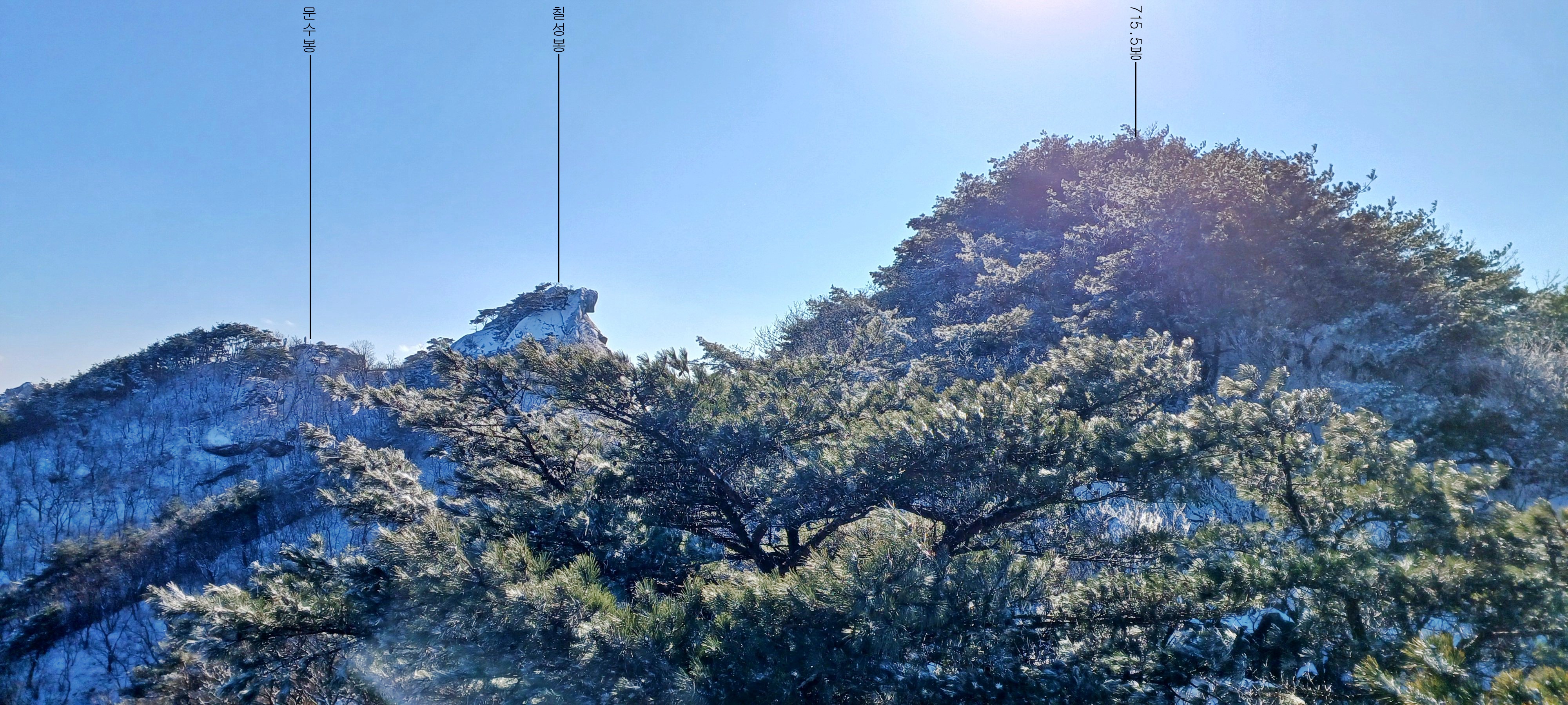 상원봉능선 최고의 조망바위로 이어가며 바라본 지나온 문수봉과 칠성봉 그리고 715.5봉