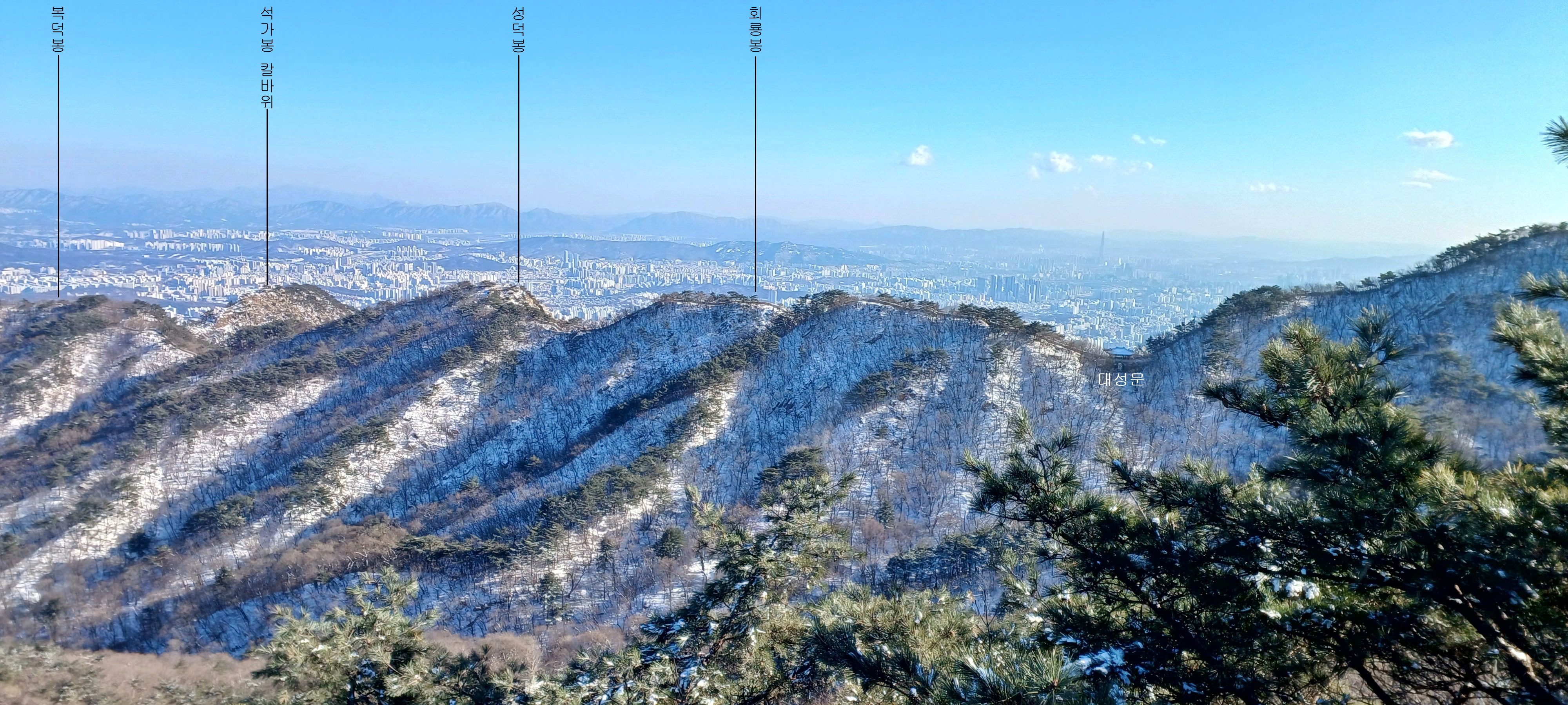 석가봉 칼바위 조망봉인 복덕봉. 성덕봉. 화룡봉. 대성문으로 이어지는 산성 주능선