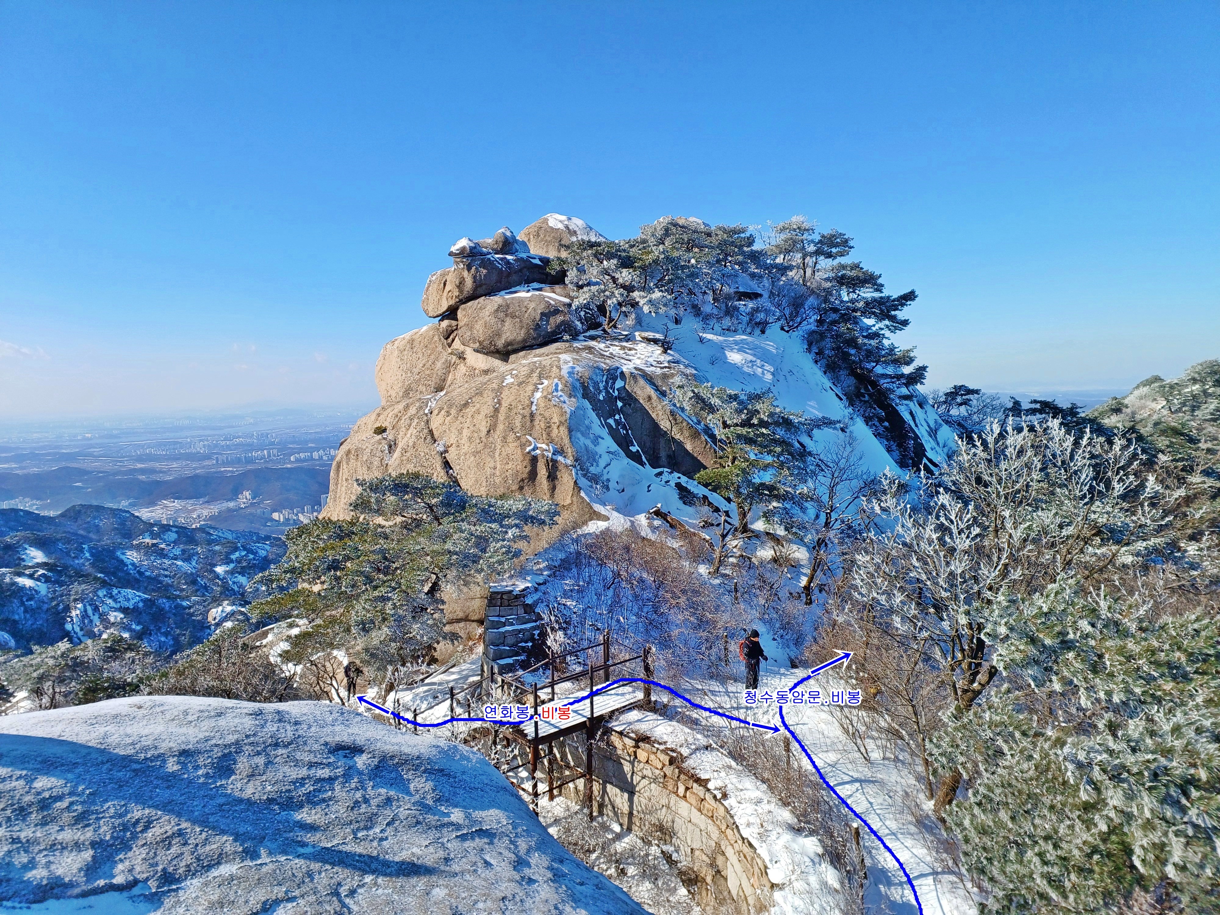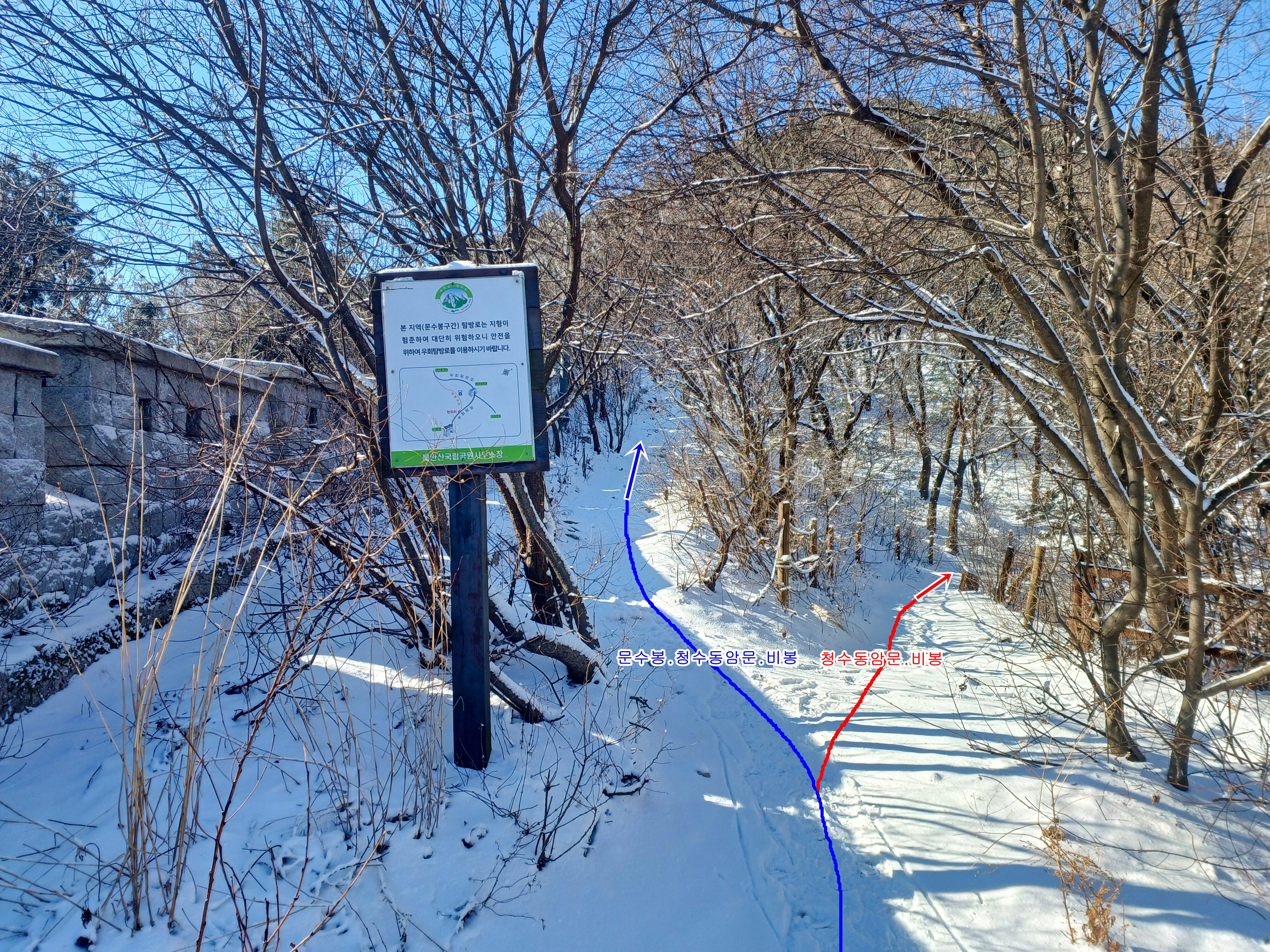 겨울철 보기보다 미끄러움으로 늘 위험한 좌측 청수동암문으로 향합니다.