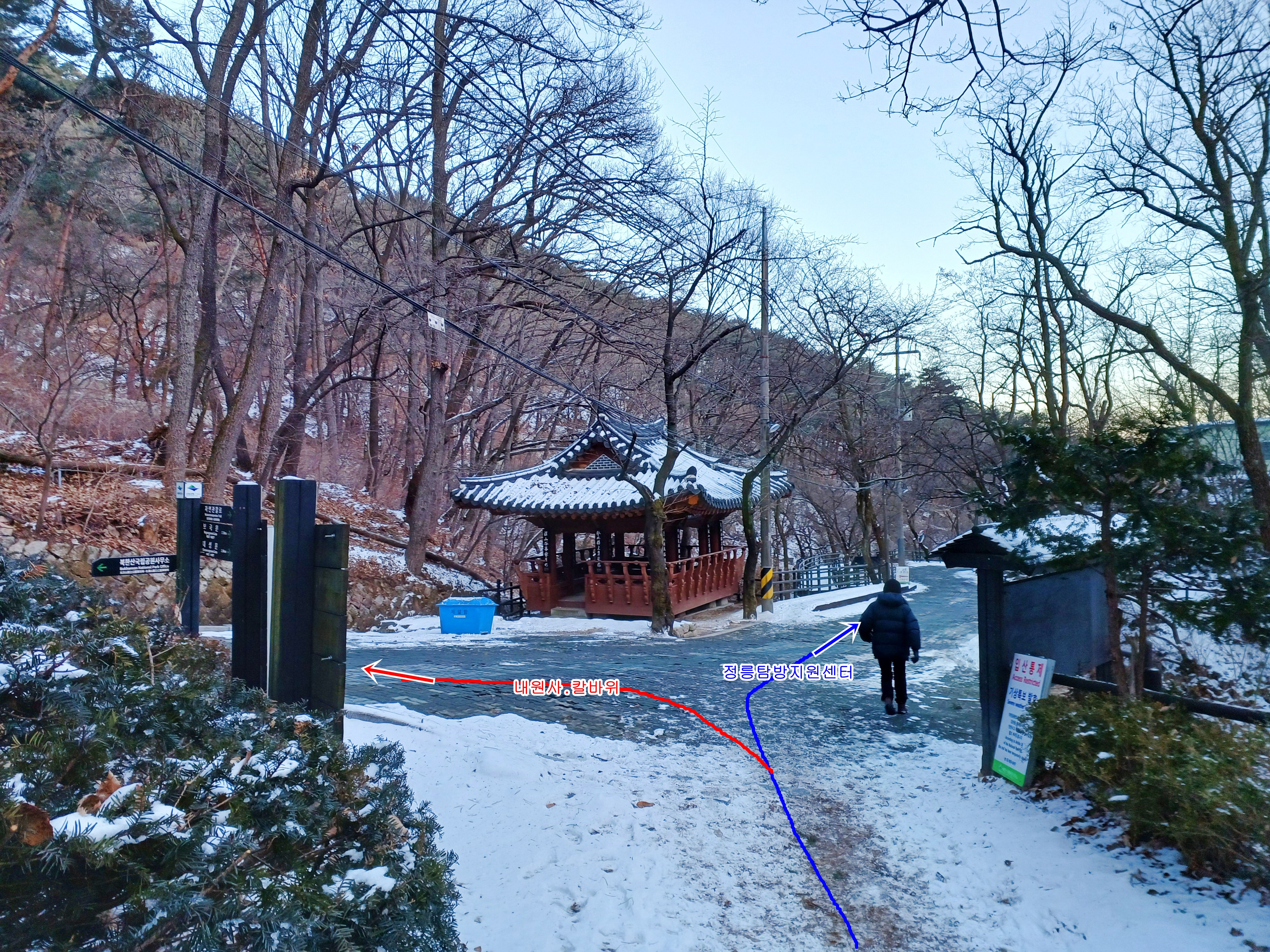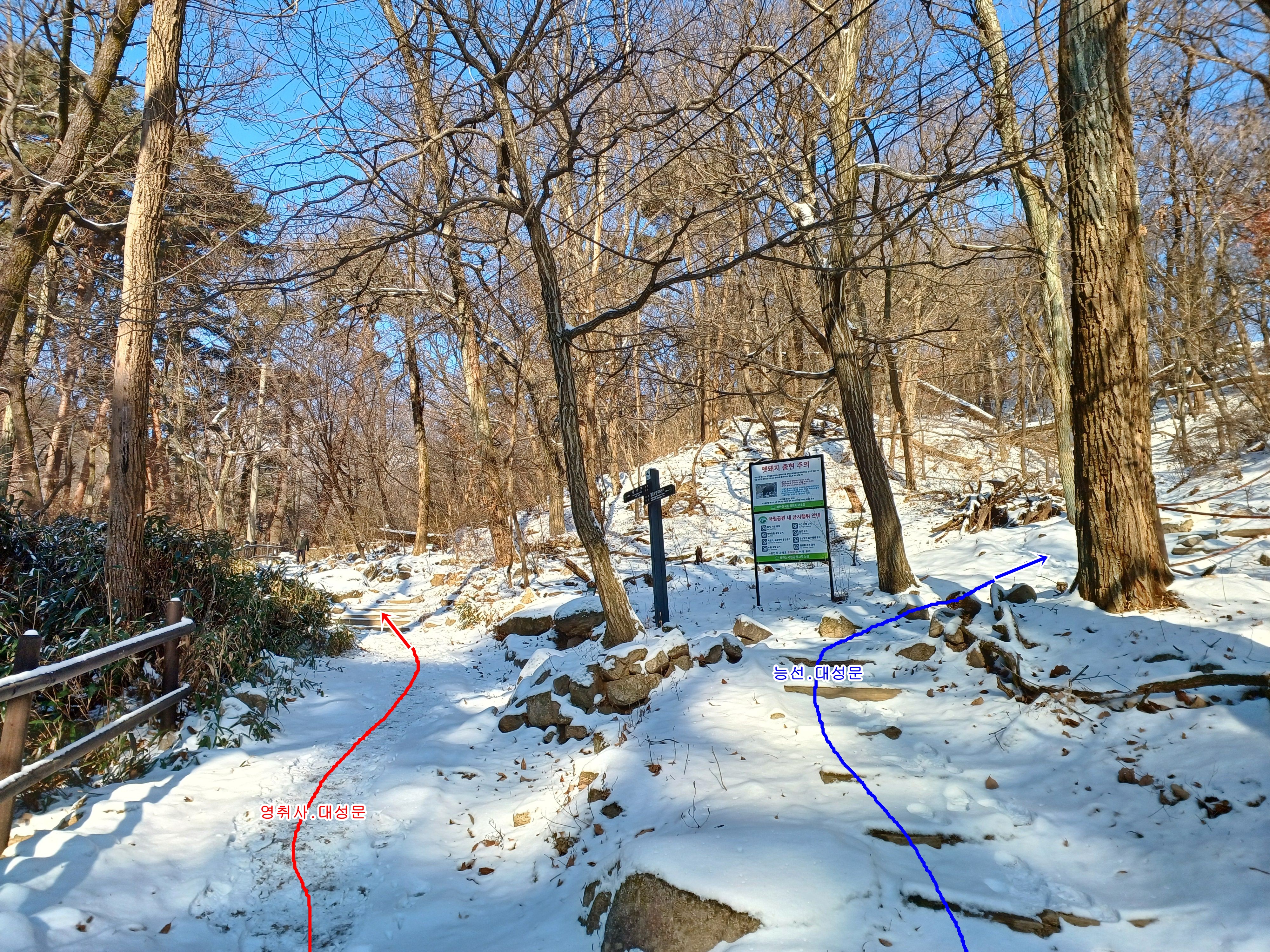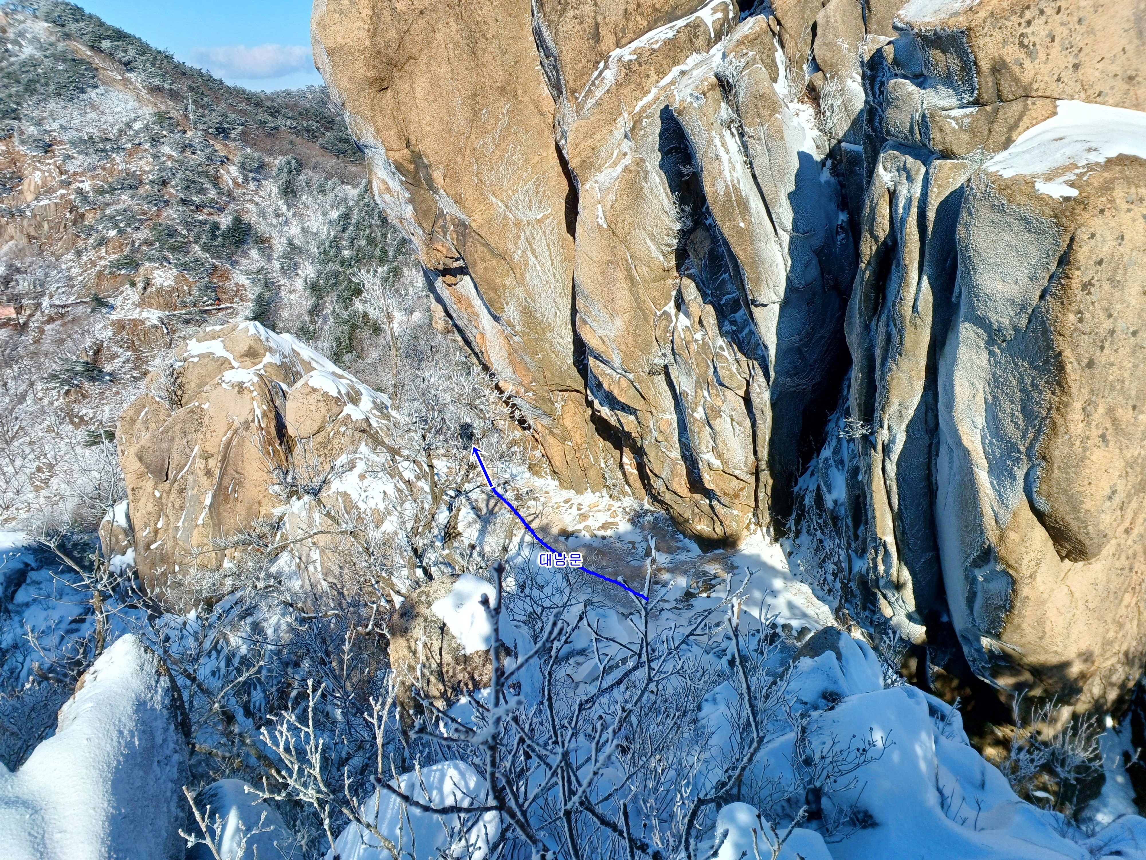 아이젠을 착용하지 않고 걷는 계곡길은 미끄러움으로 천천히 조심조심 대성문으로 이어갑니다.