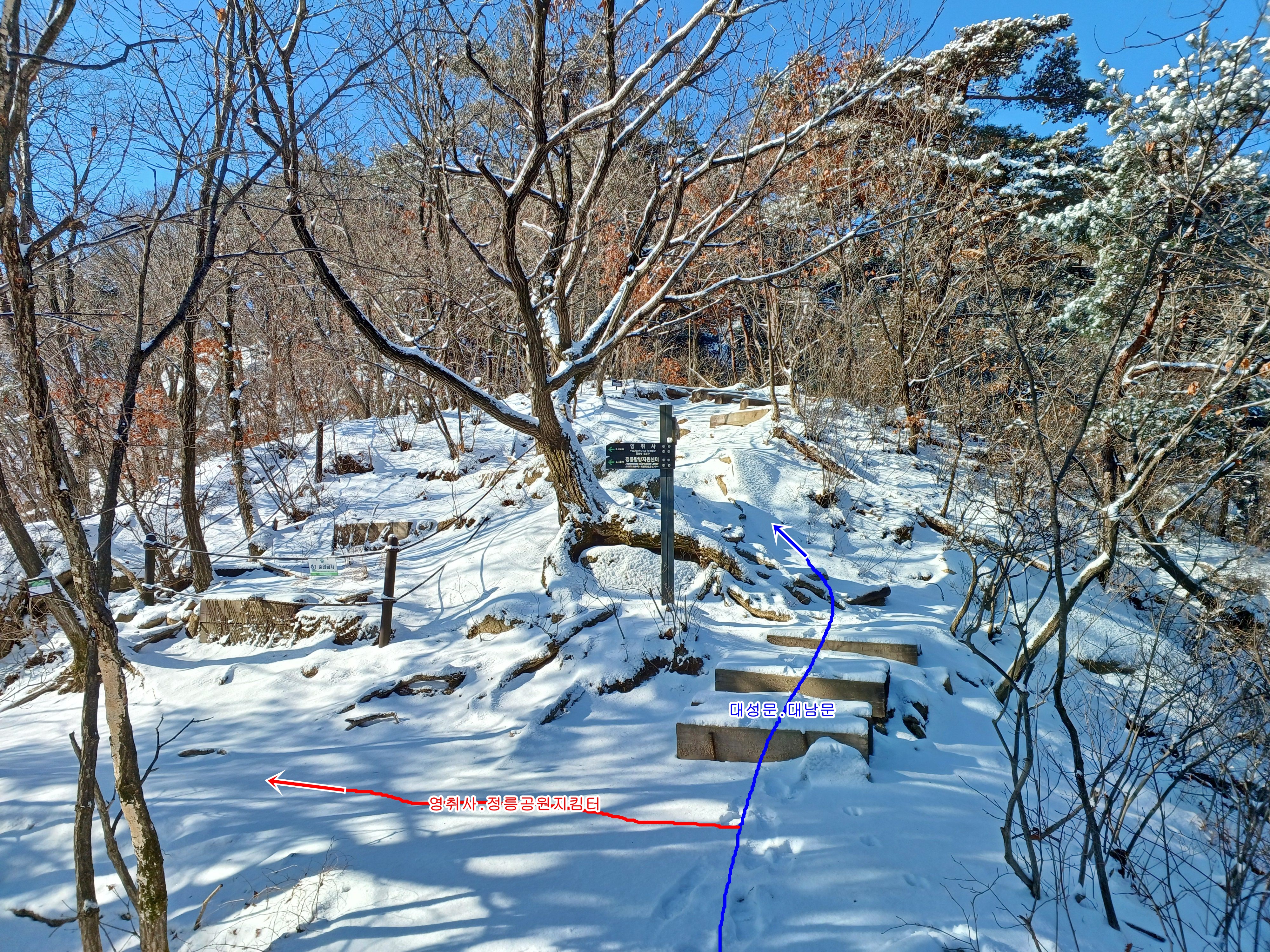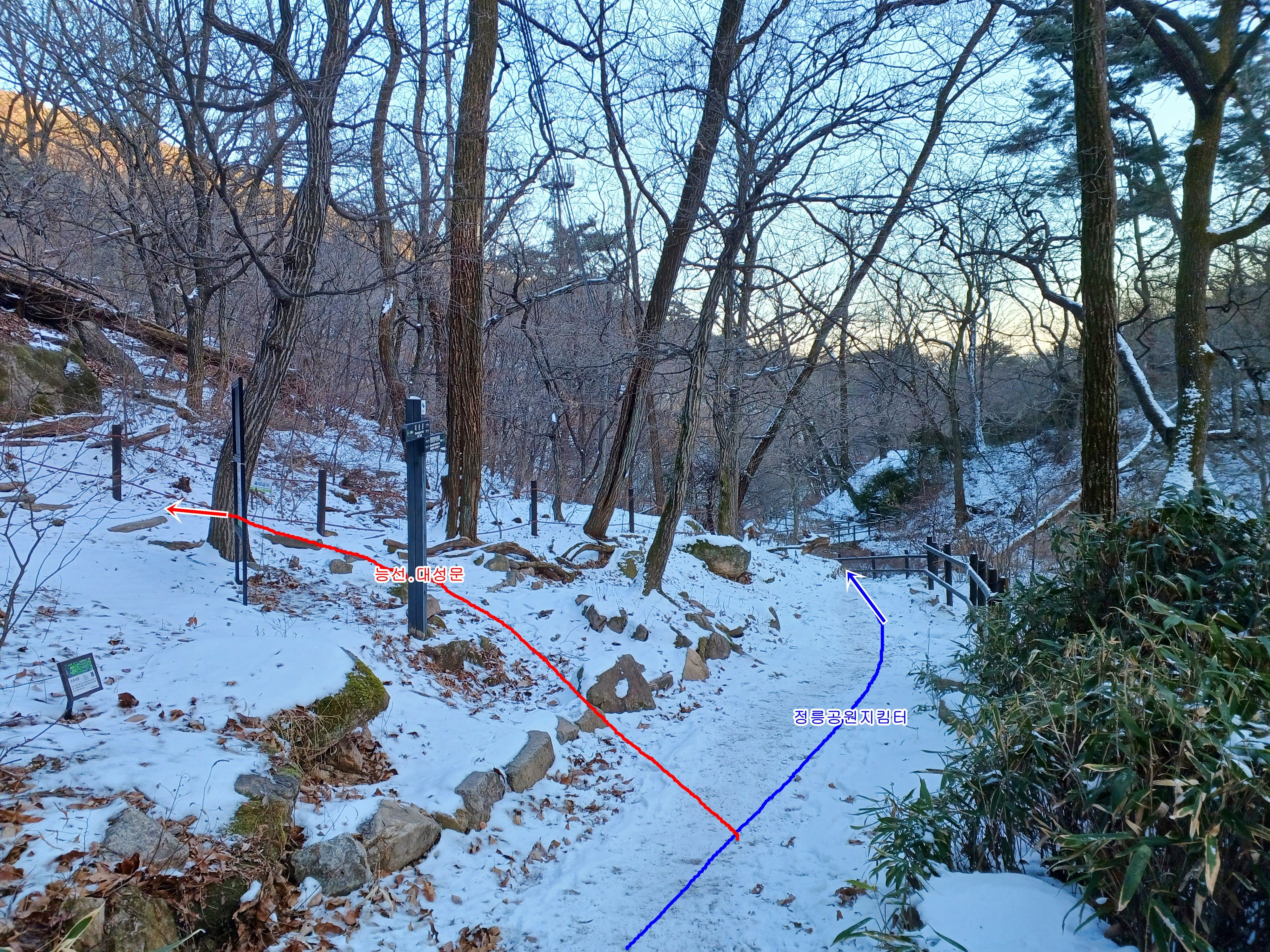 오늘 들머리인 좌측 능선 대성문 방향 갈림길에서 계속 직진 정릉공원지킴터로 하산합니다.