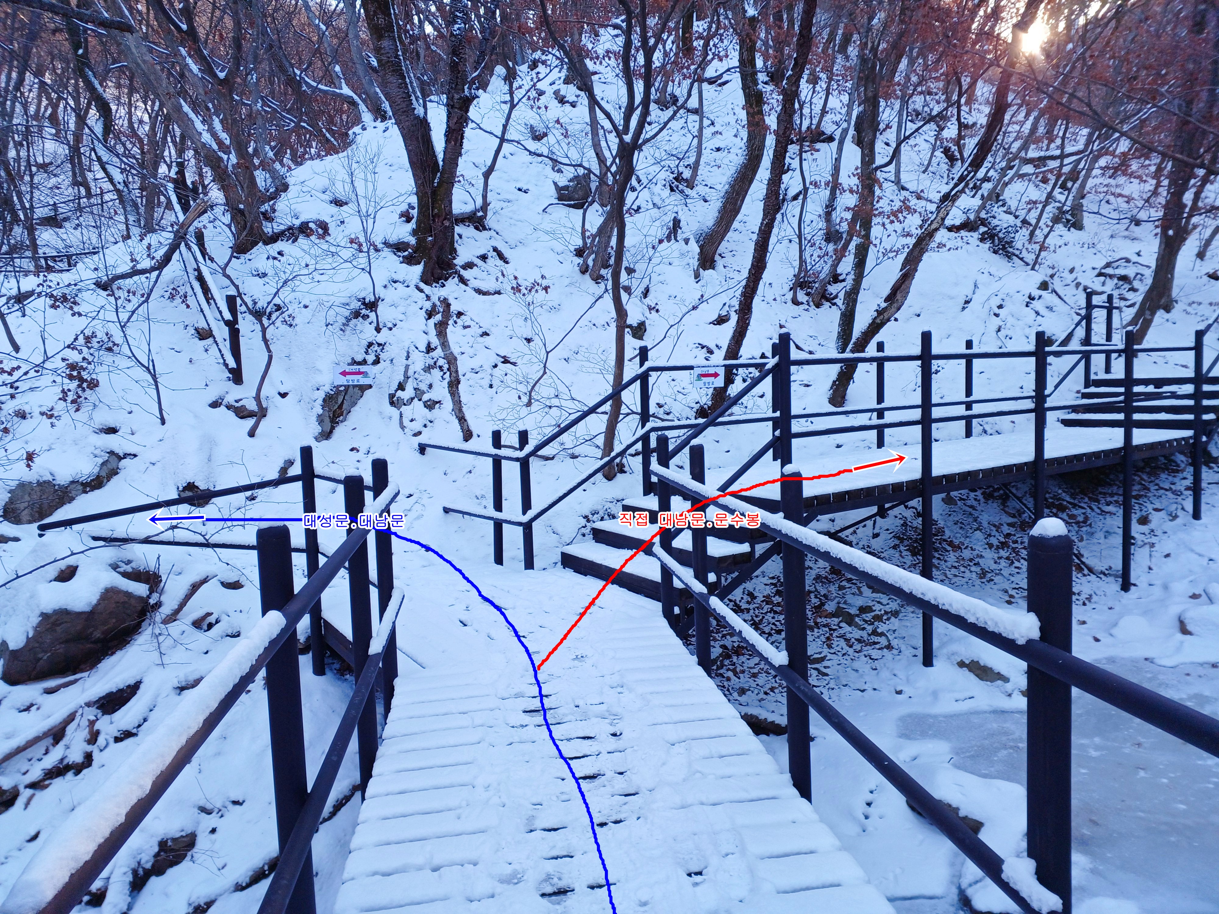 봄철이면 처녀치마로 가득한 계곡에 새롭게 설치된 데크계단 좌측 대성문. 대남문으로 진행하며 우측 빠른(직접) 대남문 방향