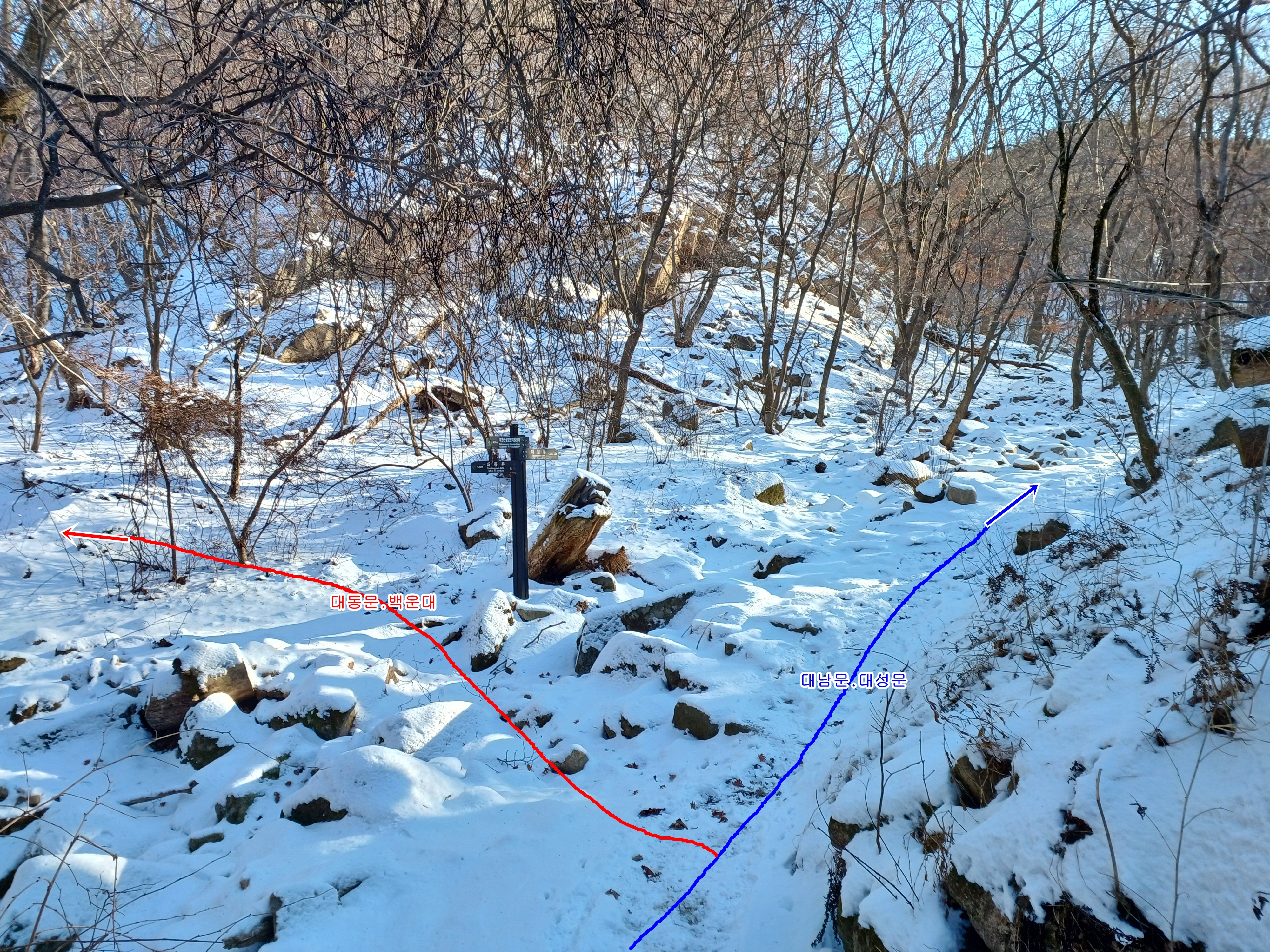 청수루 앞 갈림길 좌측 대성문을 들머리로 진행하며 우측 내원사. 칼바위. 대동문 방향